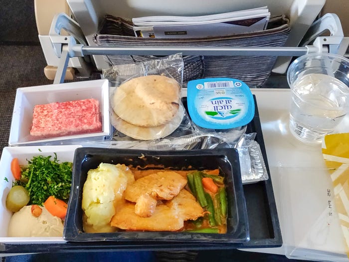 Troli makanan dijalankan beberapa saat kemudian. Dari segi rasa, makanan Etihad ini lumayan. Eh, saya mah soal makanan jarang komplain sih ya haha. Apa aja disantap, mumpung gratis. Yha! Saat itu saya dibantu seorang FA perempuan bule. Saat dia memberikan nampan berisi makanan dan menanyakan saya mau minum apa di gelas kosongnya, saya minta diisi jus.
