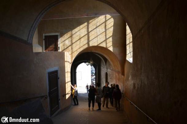Ada dua cara untuk masuk ke dalam. Pertama, lewat lorong besar yang berada di bawah bangunan yang menjadi bagian dari kasil. Cara kedua, yakni melalui jalan setapak berbatu yang langsung menuju bagian atas kastilnya. Awalnya, saya pikir untuk masuk ke sana kami harus membayar. Betapa senangnya hati –nyanyi, saat tahu kami berdua gak harus mengeluarkan satu keping koruna pun untuk menjelajahi kastil ini.