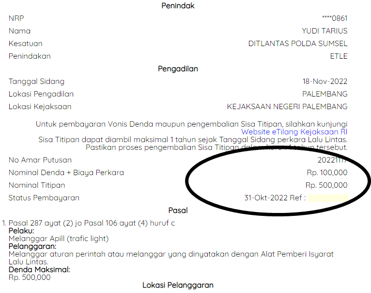 Jadilah, di tanggal 18 November 2022 saya coba akses dan ternyata benar baru terbuka situsnya dan dari sana terinformasi saya hanya dikenakan denda Rp.100.000 dari pelanggaran menerobos lampu merah itu.