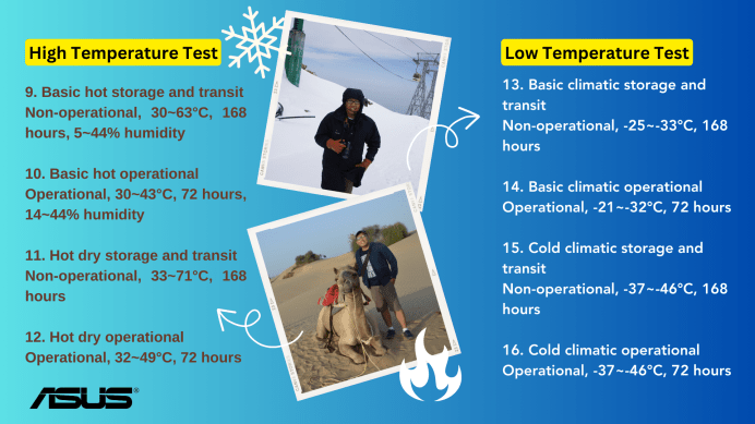 Di tahun 2015, saat berkunjung ke India, saat itu bertepatan dengan bencana gelombang panas yang menewaskan ribuan orang. Nah, ASUS pun sudah teruji di suhu tinggi. Di saat suhu kering dan panas antara 32-49 derajat celcius, ASUS mampu bertahan hingga 72 jam. Sungguh hebat!