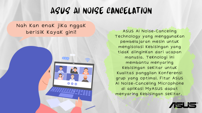 Selain itu, ASUS Vivobook 14 M1405 juga dilengkapi  dengan ASUS AI Noise-Canceling Technology di mana, dengan menggunakan pembelajaran mesin untuk mengisolasi kebisingan dari ucapan manusia yang sebetulnya tidak diinginkan. Jadi suara bising di sekitar akan disaring sehingga kualitas panggilan konferensi grup akan semakin baik.