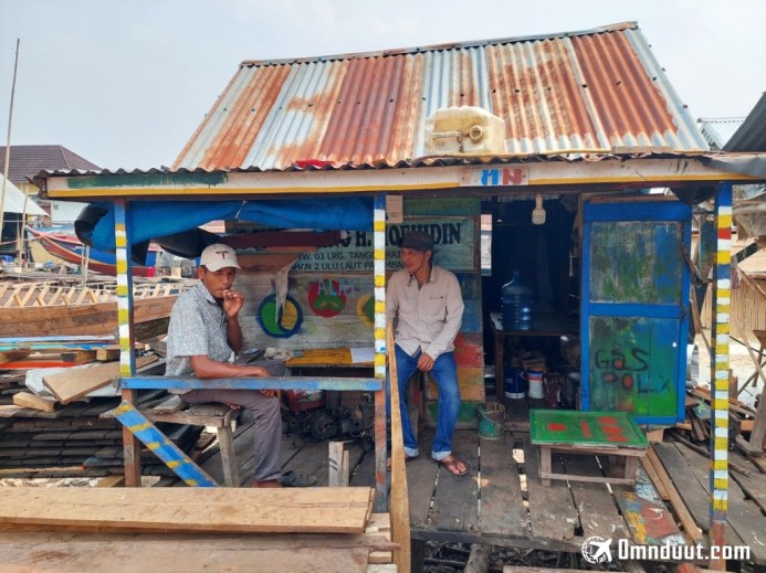 Bengkel pembuatan perahu milik Pak Dadang sederhana saja. Ada pondok kecil tempat ia berteduh dan beristirahat. Di sisi kanan pondok terlihat tumpukan papan/kayu meranti yang kemudian akan dipotong menyesuaikan ukuran perahu. Di sisi sebelah kiri ada dua bangunan beratap dengan masing-masing perahu setengah jadi terlihat berada di bangunan tersebut.
