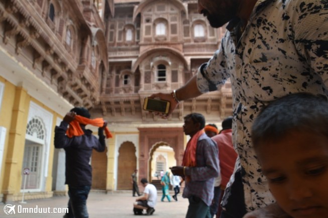 Untungnya, biaya masuk itu sudah termasuk headphone. Pengunjung bebas meminjam dengan percuma/gratis namun syaratnya paspor harus ditinggalkan. Wes nggak apa-apa, sebab untuk mengerti sejarah Mehrangarh Fort lebih dalam, ya harus mendengarkan penjelasan menggunakan headphone itu. Walau, kadang saya suka merapat ke kelompok turis yang khusus menyewa guide sih. Rasanya lebih seru ketika mendengar penjelasan mereka.