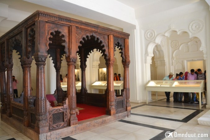 Di Mehrangarh Fort, kami juga masuk ke area yang kini dijadikan museum. Berbagai benda dipamerkan, misalnya saja howdah, tempat duduk kayu dengan dua kompartemen dilapisi lembaran emas dan perak yang biasanya diikatkan ke punggung gajah. Sebagaimana tandu, howdah adalah sarana populer untuk berpergian dan mengunjungi para wanita bangsawan yang digunakan hingga kuartal kedua abad ke-20.