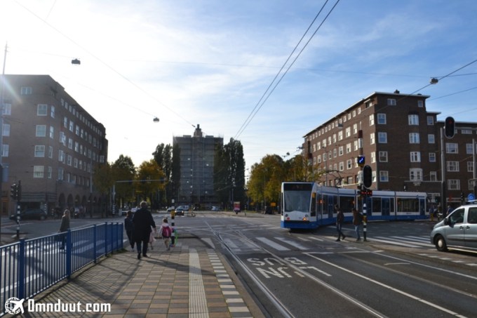 Suasana Amsterdam. Jalur tram kelihatan berada di jalanan.