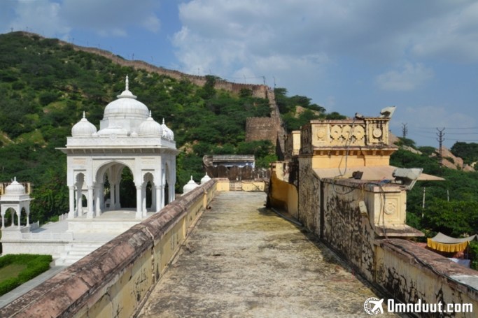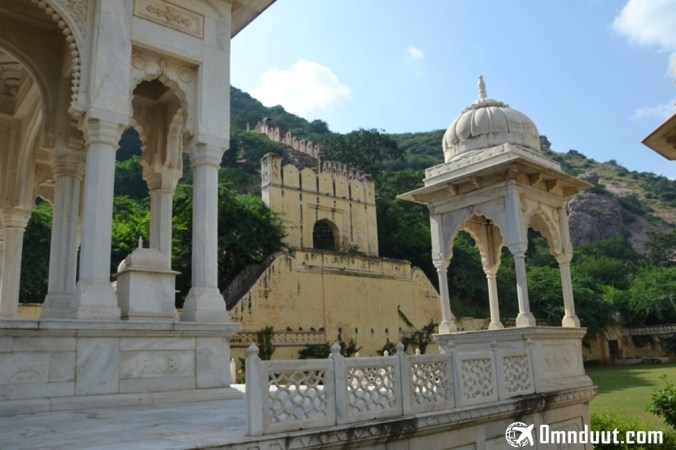 Gerbang Benteng Nahargarh-nya terlihat lebih jelas di antara cenotaph.