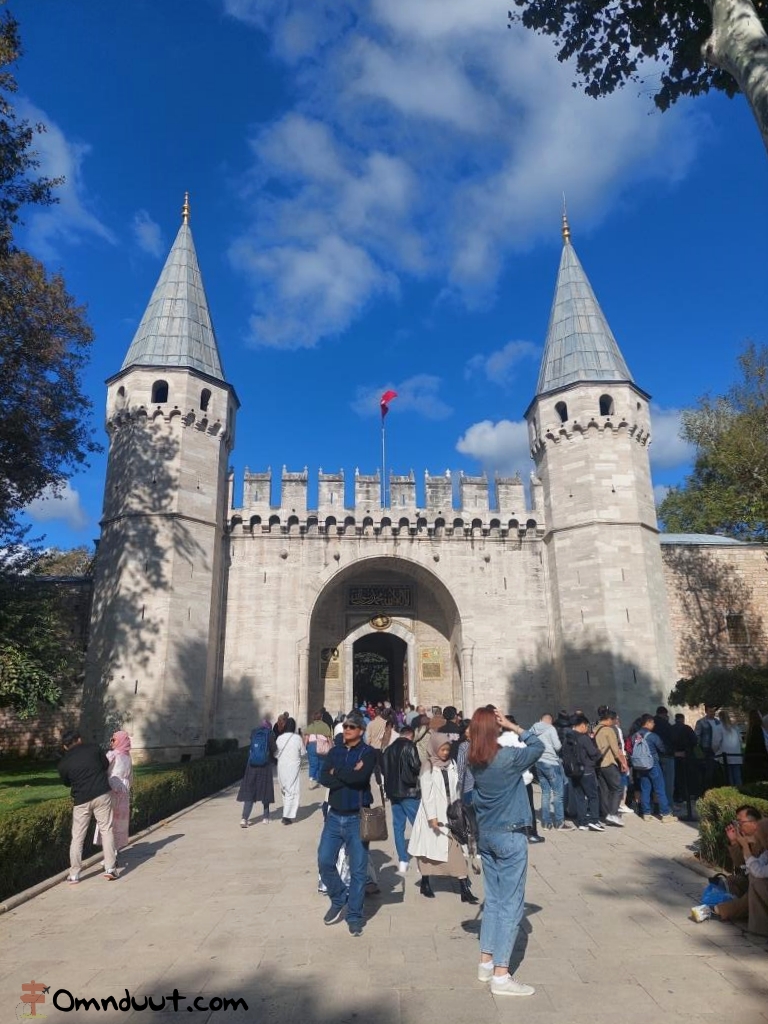 Begitu mendekati istana, kami akan disambut dengan Gerbang Kekaisaran yang merupakan pintu masuk utama ke first courtyard atau Halaman Pertama. Sultan akan memasuki istana melalui Gerbang Kekaisaran yang terletak di sebelah selatan istana. Gerbang besar ini, awalnya dibangun pada tahun 1478, kini dilapisi marmer abad ke-19. Lengkungan tengahnya mengarah ke lorong berkubah tinggi; kaligrafi Ottoman berlapis emas menghiasi struktur di bagian atas, dengan ayat-ayat Al-Qur’an dan tughra para sultan.