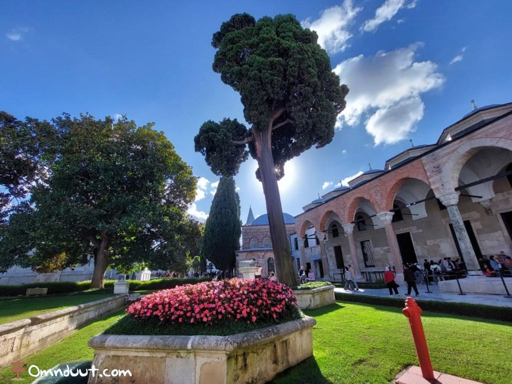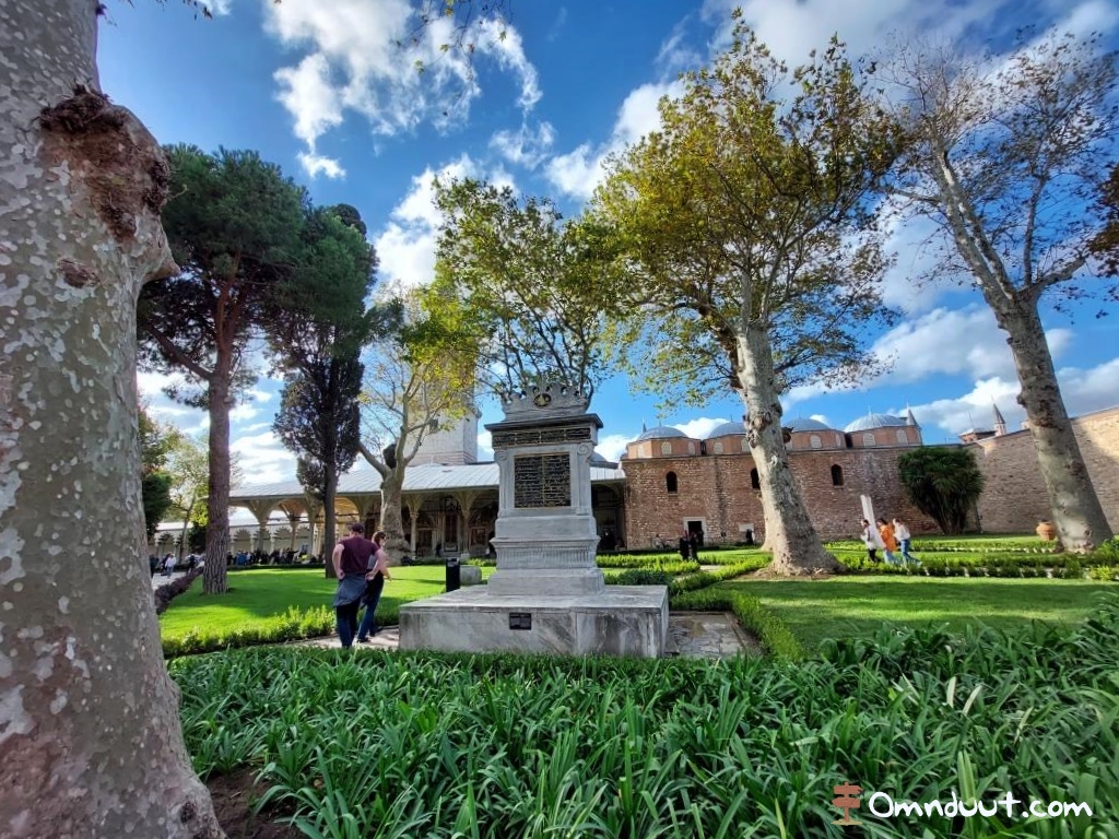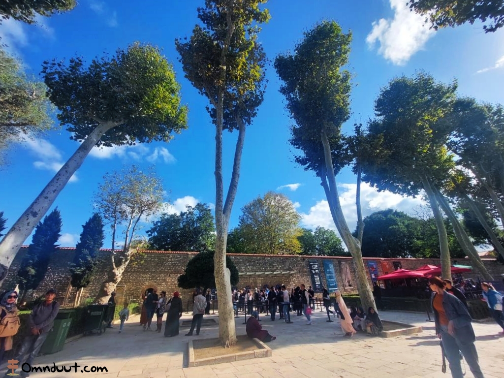 Setelah melewati pemeriksaan yang ketat di gerbang utama, kami mulai berjalan memasuki Halaman Pertama yang berfungsi sebagai kawasan luar atau taman dan merupakan halaman terbesar dari semua halaman istana. Lereng curam yang mengarah ke laut telah dibuat bertingkat-tingkat di bawah pemerintahan Bizantium. Ya, kompleks Istana Topkapi ini emang berada di ketinggian dan dari kejauhan langsung terlihat panorama kota Istanbul yang berada di seberang Laut Marmara.